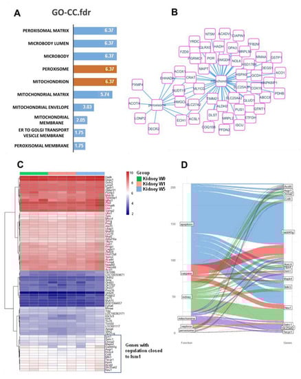 Mitochondria and peroxisome regulation during ISM1 time course model during kidney regeneration. (A) Functional enrichment on gene ontology cellular component database of genes found correlated to ISM1 during kidney regeneration (fdr: false discovery rate): barplot of negative log10 FDR adjust p-values; (B) Functional enrichment network performed with mitochondria and peroxisome related genes found correlated to ISM1; (C) Expression heatmap of best 75 genes found correlated to ISM1 expression kidney regeneration: blue gene cluster defined genes with regulation closed to ISM1; (D) Alluvial plot built on gene-function found in NCBI database with genes highlighted closely regulated with ISM1 during kidney regeneration (quantitative colored links represent the numbers of NCBI-Pubmed articles connected).
