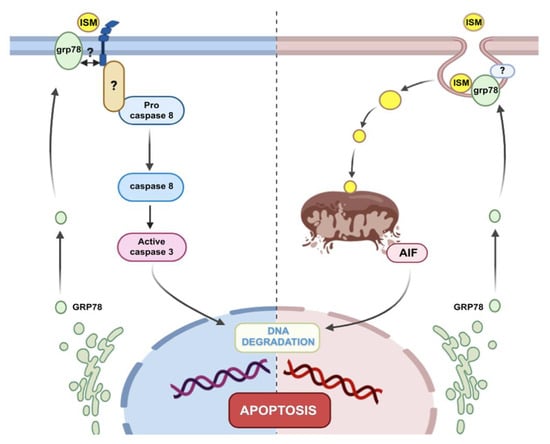 Classically, two main apoptotic pathways have been described: (i) the extrinsic or death receptor pathway and (ii) the intrinsic or mitochondrial pathway. The mitochondrial membrane potential (ΔΨm) is a key indicator of mitochondrial activity, as it reflects the process of electron transport and oxidative phosphorylation, essential for ATP production [28]. The drop of ΔΨm is considered an early event in the apoptotic cascade, as it occurs before nuclear degradation. In our study we showed that ISM1 triggers the drop of ΔΨm, suggesting mitochondrial apoptosis. This event is consistent with previous studies performed on endothelial cells where the cell death was mediated via mitochondria through GRP78. The authors described two different pathways: (i) activation of p53, synthesis of proapoptotic proteins (e.g., BH3-only proteins) and subsequent mitochondrial damage or, (ii) through an endosomal pathway in which ISM1, transported by SNAP25, could directly destabilize mitochondria [21]. In our experimental setting we did not observe activation of p53 (not shown), so we are tempted to privilege a direct interaction of ISM1 with mitochondria via endosomes.