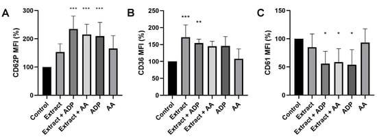 We first tested the effects of a 9-D1t-PhytoP-rich extract on platelet activation markers in whole blood. The preincubation with the extract alone was only able to upregulate glycoprotein IV (CD36), an atherosclerotic stress marker (p = 0.0009) (Figure 1B). However, the extract did not impair the CD62P and CD36 expression induced by ADP and AA (both p < 0.001) (Figure 1A,B). A good correlation was observed between CD62P and CD36 mean fluorescence intensity (MFI) for all the conditions. Finally, platelet aggregation (decrease in CD61 MFI) was induced by ADP in whole blood (p < 0.05), but also pretreated with extract/ADP and extract/AA, showing a synergistic effect with AA (all p < 0.05, Figure 1C). Arachidonic acid alone was not able to stimulate platelet aggregation in a significant way (Figure 1C). These results indicate that Gracilaria sp. Extract alone induces platelet activation, but it was not sufficient for an aggregation response.