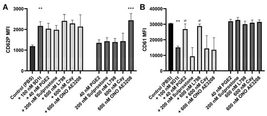 Effects of 100 nM 9-D1t-PhytoP alone or in combination with distinct EP receptor ligands on the expression of platelet activation markers. (A) CD62P (P-selectin) expression. (B) CD61 (glycoprotein IIIa) expression. Samples of whole blood were stimulated for 10 min and analyzed by flow cytometry. MFI: Mean fluorescence intensity. The bars show mean and standard deviation (n = 5 different blood donors). ** p < 0.01, *** p < 0.001 vs. control condition (PBS); and ≠ p < 0.05 vs. 9-D1t-PhytoP.