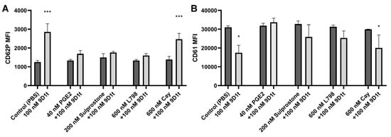 The EP4 agonist Cay10598 inhibits the effect of 9-D1t-PhytoP. (A) CD62P (P-selectin) expression. (B) CD61 (glycoprotein IIIa) expression. Samples of whole blood were preincubated with EP3/EP4 ligands (black) for 10 min plus 100 nM 9-D1t-PhytoP (gray) for additional 10 min at 37 °C and analyzed by flow cytometry (n = 5). MFI: mean fluorescence intensity. * p < 0.05; *** p < 0.001 vs. control condition (PBS).