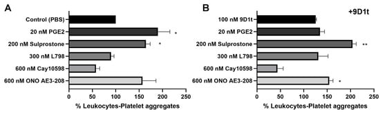9-D1t-PhytoP effect on the formation of platelet–leukocyte in fresh EDTA blood. (A) Relative counts in the presence of EP3/EP4 ligands. (B) Relative counts in the presence of EP3/EP4 ligands plus 100 nM 9D1t. Values are normalized to control (PBS). Values are mean ± SD (n = 3 with different blood donors). Stars denote significant differences as compared to samples without activation (PBS, control) */** p < 0.05/0.01, * p value derived from 2-tailed paired t-test.