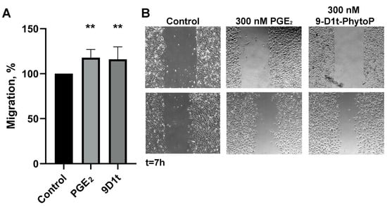 Migration (wound closure) in human endothelial Ea.hy926 cells in the presence of 300 nM PGE2 and 9-D1t-PhytoP, respectively. (A) Percentage of migrated area following the wound healing assay (n = 3). (B) Representative images of the wound healing assay at t = 0 and t = 7 h. Statistic differences compared with control ** p < 0.01.