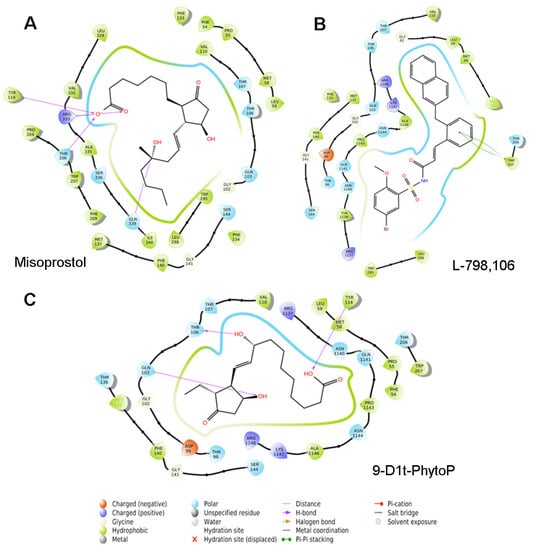 Two-dimensional protein–ligand interactions diagram generated between EP3 receptor (PDB: 6M9T) and (A) Misoprostol (EP3 agonist); (B) L-798,106 (EP3 antagonist); and (C) 9-D1t-PhytoP ligands, using the Ligand Interaction script in Maestro (Schrödinger Inc., www.schrodinger.com, accessed on 14 May 2022). It outlines a cavity consisting of several proximate hydrophobic and hydrophilic residues (Thr 106 and 107, shown in blue circles) where 9-D1t-PhytoP potentially binds. A hydrogen bond between the ligand and Gln 103 is shown by an arrow.