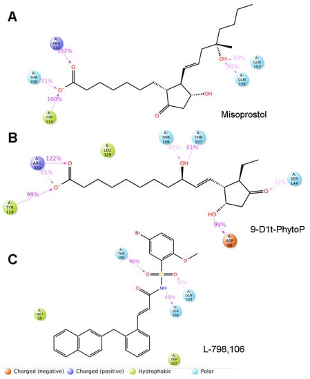 Two-dimensional protein–ligand interactions of the molecular dynamics diagrams generated between EP3 receptor (PDB: 6M9T) and (A) Misoprostol (EP3 agonist), (B) 9-D1t-PhytoP, and (C) L-798,106 (EP3 antagonist) using the Simulation Interactions Diagram script in Maestro (Schrödinger Inc., www.schrodinger.com, accessed on 20 December 2022).