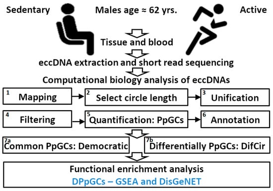 The following aims were instigated: Develop a new computational method and tool for identifying genomic regions that produce differentially eccDNA from gene fragments in two different states like disease versus control, degrees of illness development, response to treatment, sports activity; demonstrate the method on a short-read sequenced circulomics data set of human SkM from active and sedentary participants of similar age and same sex, and characterize the eccDNA profiles and differences induced by lifelong exercise activity. The experimental setup and computational analysis workflow are presented in Figure 1.
