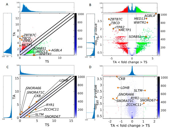Comparison of the sensitivity of circulomics and transcriptomics data from SkM to detect differences between sedentary and active individuals. (A) Pairwise scatter plot and (B) volcano plot of circulomics data from tissue sedentary (TS) and tissue active (TA). (C) Pairwise scatter plot and (D) volcano plot of RNA-seq data from TS and TA. In all plots the color bar indicates the scattering density. Darker blue color corresponds to higher scattering density. In the scatter plot the up-DPpGCs in the TA samples (ordinate) are shown with red dots, and up-DPpGCs and DEGs in the TS samples (abscissa), with green. Several gene positions are shown as orange circles. The levels are log2-scaled. The histograms visualize the eccDNA production and gene expression spectra.