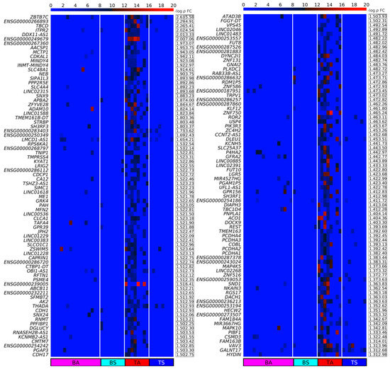 Heatmaps of the up-DPpGCs in the SkM of the physically active (TA) compared to the sedentary lifestyle (TS) group in decreasing order of significance. The color bar codifies the split read count of the eccDNA per gene in a log2 scale. Higher count corresponds to a redder color. The –log10 (p-value) and the absolute value of the log2 of the fold change (FC) of the DPpGCs are presented in a table to the right of the heatmap. The PpGCs in the blood samples (leukocytes) from the physically active (BA) and sedentary (BS) group are presented in the heatmap for comparison.