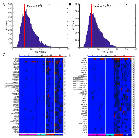 Democratic method results on the detection of common PpGCs (CPpGCs) in sedentary (TS) and active (TA) SkM. Distribution of the PpGCs for (A) TS and (B) TA. The vertical red line shows the position of the maximum of the distribution. Heatmaps of the CPpGCs in (C) TS and (D) TA. The color bars codify the split read counts of the eccDNAs per gene in a log2 scale. Higher count corresponds to a redder color. The number of votes of the PpGCs is presented in tables to the right of the respective heatmaps.