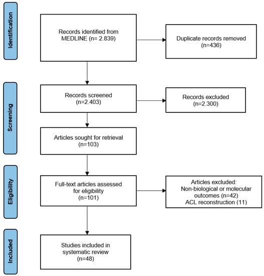 The following keywords were applied: “PRP ligament”, “Platelet-rich plasma ligament”, “PRP tendon”, and “Platelet-rich plasma tendon”. The initial data search identified 2839 articles. After duplicate removal and title and abstract screening following the inclusion and exclusion criteria, 103 articles were considered eligible for full-text retrieval. Finally, and after detailed evaluation of the full texts, 48 articles were included for further analysis. Specifically, 24 of them referred to ligaments, 21 to tendons and 3 to both tendons and ligaments (Figure 1).