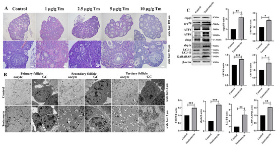 Reticulophagy activated by the ER stress inducer tunicamycin causes POF. (A): Histology of ER stress inducer tunicamycin (Tm)-treated mouse ovaries; (B): Ultrastructure of oocytes and granulosa cells (GCs) in primary, secondary, and tertiary follicles by transmission electron microscopy detection; (C): Western blot analysis of ovaries from control and 5 μg/g tunicamycin-treated mice. β-actin was used as a reference protein, *** p < 0.001, ** p < 0.01, * p < 0.05.