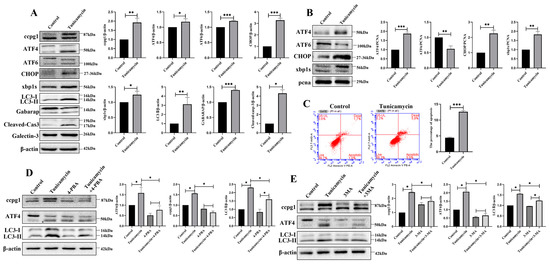 Reticulophagy activated by the ER stress inducer tunicamycin causes granulosa cell apoptosis. (A): Detection of the UPRer and reticulophagy by Western blotting and analysis of total protein in the control and 5 μM tunicamycin-treated granulosa cells; (B): Detection of the UPRer by Western blotting and analysis of nuclear protein in the control and 5 μM tunicamycin-treated granulosa cells; (C): Detection of cellular apoptosis by flow cytometry in the control and 5 μM tunicamycin-treated granulosa cells; (D): Detection of the UPRer molecule ATF4 and reticulophagy by Western blotting and analysis of total protein in the control, 5 μM tunicamycin-, 5 Mm+4-PBA-, and 5 μM tunicamycin+5 mM 4-PBA-treated granulosa cells; (E): Detection of the UPRer molecule ATF4 and reticulophagy by Western blotting and analysis of total protein in the control, 5 μM tunicamycin-, 10 mM 3-MA-, and 5 μM tunicamycin+10 mM 3-MA-treated cells. β-actin was used as a reference protein, *** p < 0.001, ** p < 0.01, * p < 0.05.