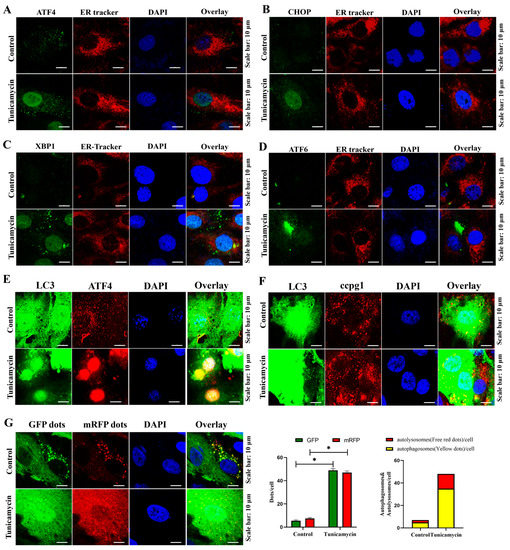Immunofluorescence of markers of the UPRer and autophagy in control and 5 μM tunicamycin-treated cells. (A): Colocalization of ATF4 (green) protein and ER tracker (red); (B): Colocalization of CHOP (green) protein and ER tracker (red); (C): Colocalization of XBP1s (green) protein and ER tracker (red); (D): Colocalization of ATF6 (green) protein and ER tracker (red); (E): Colocalization of ATF4 (red) protein and GFP-LC3 (green); (F): Colocalization of CCPG1 (red) protein and GFP-LC3 (green); (G): Autophagic flux detection by mRFP-GFP-LC3B staining. At least 50 different cells from different fields were analyzed, and the dots were blindly counted by three different persons. The nuclei were stained with DAPI (blue). * p < 0.05.