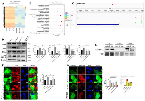 ATF4 targets MAP1LC3/CCPG1. (A): Heatmap of control and 5 μM tunicamycin-treated cells generated from the ChIP sequencing results; (B): Enriched KEGG pathway analysis of the ChIP sequencing results; (C): Binding site of ATF4 in MAP1LC3A; (D): Detection of reticulophagy by Western blotting and results of ATF4 inhibition in 5 μM tunicamycin-treated cells; (E): MAP1LC3A interacts with CCPG1, as revealed by co-IP; (F): Colocalization of CCPG1 (red) protein and GFP-LC3 (green); (G): Autophagic flux detection by mRFP-GFP-LC3B staining. The nuclei stained with DAPI (blue). At least 50 different cells in different fields were analyzed, and the dots were blindly counted by three different individuals. * p < 0.05.