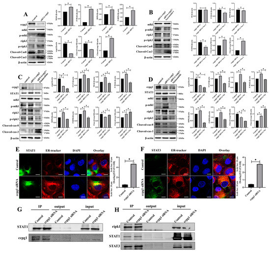 Activation of necroptosis by downregulation of CCPG1 by STAT1 and STAT3. (A): Results from the detection of necroptosis by Western blotting in CCPG1-knockdown granulosa cells; (B): Detection of necroptosis by Western blotting in granulosa cells treated with the necroptosis inhibitor necrostatin-1; (C): Detection of necroptosis and STAT1 by Western blotting in granulosa cells treated with the STAT1 inhibitor fludarabine; (D): Detection of necroptosis and STAT1 by Western blotting in granulosa cells treated with the STAT3 inhibitor niclosamide; (E): Colocalization of STAT1 (Green) and ER tracker (Red) in CCPG1-knockdown cells; (F): Colocalization of STAT3 (Green) and ER tracker (Red) in CCPG1-knockdown cells; (G): CCPG1 directly interacts with STAT1, as revealed by co-IP detection; (H): STAT1 and STAT3 directly interact with ripk1, as revealed by co-IP detection. β-Actin was used as a reference protein, * p < 0.05.