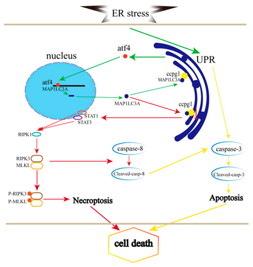 Pathway through which CCPG1 in necroptosis is linked to ER stress-mediated apoptosis. The green line indicates ER stress, the UPRer, and autophagy; the red line indicates necroptosis; the yellow line indicates apoptosis.