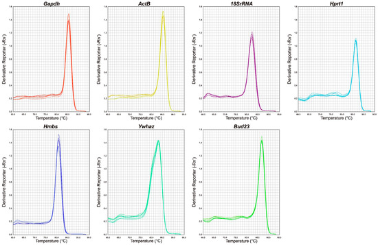 Validation of qRT-PCR primers. Melting curve analysis for testing the specificity of gerbil primers for candidate reference genes. A single peak indicates a single PCR product.