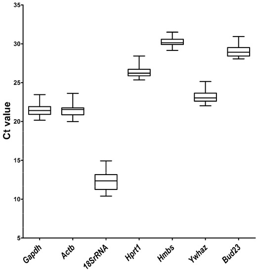 Although Gapdh, Actb, 18S rRNA, Hprt1, Hmbs, and Ywhaz are widely used as housekeeping genes in a context of reference gene expression, the Bud23 gene was also selected in this study. This gene encodes rRNA methyltransferase and ribosome maturation factor, the protein that specifically methylates the N7 position of a guanine in 18S rRNA. It is involved in ribosome biogenesis, especially pre-rRNA processing steps leading to small subunit rRNA production independently of its RNA-modifying catalytic activity [25]. The methyl transferase activity of Bud23 is dispensable for cell growth; however, Bud23 deletion leads to a strong defect in subunit export. It is suggested that Bud23 promotes a critical transition event to facilitate folding of the central pseudoknot of the small subunit, so it serves as a late checkpoint for monitoring the export competence of the small subunit of rRNA [25,26]. Recently, a mechanism that regulated mitochondrial content and function through the generation of Bud23-dependent ribosomes was recorded in cardiac cells [27]. A tumor-promoting role of Bud23 in glioma cells [28] and its function as a regulator of chromatin structure were also reported [29].
