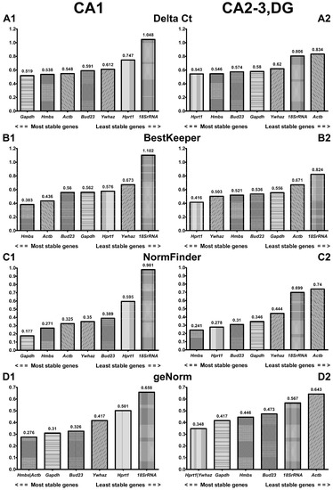 The comparison of average standard deviation made by the ΔCt method indicated that Gapdh, Hmbs, Actb, and Bud23 were the most stably expressed in the CA1 sector during postischemic reperfusion (Figure 3A1), whereas Hprt1, Hmbs, Bud23, and Gapdh were the most stably expressed in the CA2-3,DG sector (Figure 3A2), with the SD average below 0.6 for each gene (Table S2). Slightly higher values, 0.61 and 0.62, were recorded for Ywhaz in CA1 and CA2-3,DG, respectively. Hprt1 and 18S rRNA showed the highest fluctuation of ΔCt in CA1, and 18S rRNA and Actb showed the highest fluctuation in CA2-3,DG.