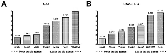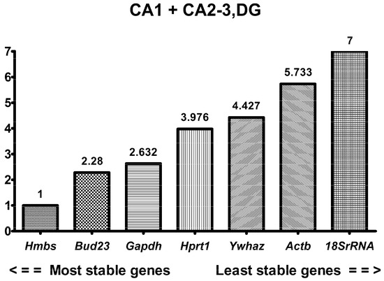 The comprehensive stability ranking by RefFinder showed that Hmbs (1.41) and Hprt1 (1.19) were the most stable reference genes in CA1 and CA2-3,DG, respectively (Figure 4A,B, Table S2). The second and third most stable genes were Gapdh (1.86) and Actb (2.06) for CA1, and Hmbs (2.21) and Ywhaz (2.66) for CA2-3,DG. Bud23 was the fourth in order of stability in both hippocampal sectors. The order of the remaining genes in CA1 was as follows: Ywhaz > Hprt1 > 18S rRNA, and in CA2-3,DG the following order was observed: Gapdh > 18S rRNA > Actb.