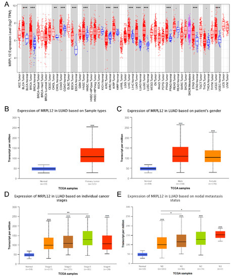 MRPL12 mRNA expression level in LUAD. (A) MRPL12 mRNA level was upregulated in various types of malignancies from TIMER database, including LUAD. (B) MRPL12 mRNA level was markedly increased in LUAD tissues from UALCAN database. (C–E) MRPL12 mRNA level was overexpressed in LUAD samples compared with normal samples, as analyzed by patients’ gender, cancer stage, and nodal metastasis status. Multiple group comparisons were performed with ANOVA followed by the Bonferroni post hoc test. * p < 0.05, ** p < 0.01, *** p < 0.001.