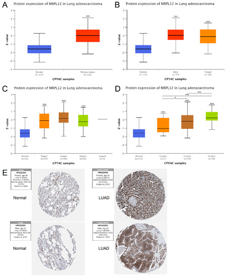MRPL12 protein expression level in LUAD. (A) MRPL12 protein level was upregulated in LUAD tissues from UALCAN. (B–D) MRPL12 protein level was increased in LUAD samples compared with normal samples and analyzed by gender, cancer stages, and tumor grade. (E) IHC images of MRPL12 in LUAD and normal lung tissues in the HPA database. Multiple group comparisons were performed with ANOVA followed by the Bonferroni post hoc test. * p < 0.05, *** p < 0.001.