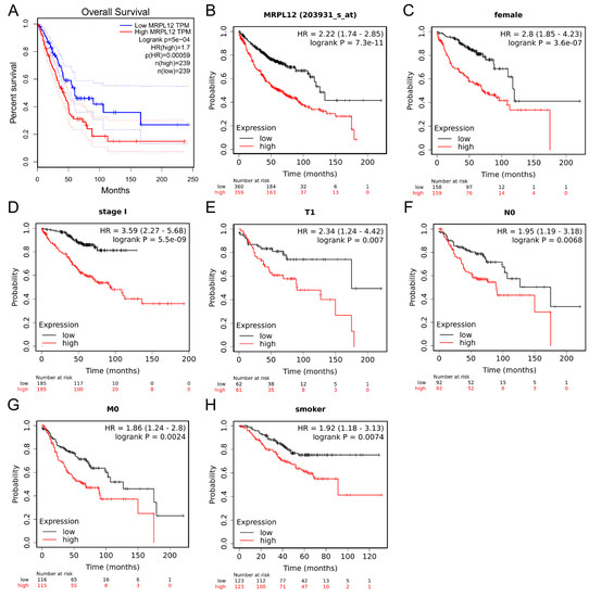 Prognostic value of MRPL12 in LUAD. (A,B) High MRPL12 expression was related to shorter OS in LUAD patients from GEPIA and Kaplan–Meier plotter databases. (C–H) High MRPL12 expression was related to worse OS in different subgroups, including female, stage I, T1, N0, and M0, and smoker cohorts.