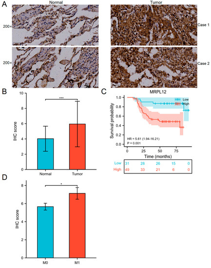 Correlation between MRPL12 expression and prognosis of LUAD patients from TMA. (A) IHC images of MRPL12 in LUAD and matched normal tissues. (B) IHC score of MRPL12 was higher in LUAD tissues. (C) High MRPL12 expression in LUAD patients was related to worse survival. (D) IHC score of patients with metastasis was higher than that of patients without metastasis. * p < 0.05, *** p < 0.001.