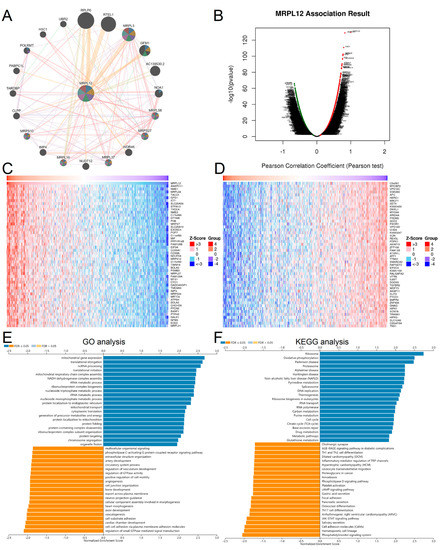 To investigate the potential biological functions of MRPL12 in LUAD, we identified its co-expressed genes and related pathways using LinkedOmics. The results show that 19,988 genes were correlated with MRPL12 in LUAD, including 8664 positively and 11,324 negatively correlated genes (Figure 5B). Heatmaps of the top 50 significant genes with positive and negative correlations with MRPL12 are exhibited in Figure 5C,D. Further Gene Ontology (GO) and Kyoto Encyclopedia of Genes and Genomes (KEGG) pathway enrichment analyses were conducted. GO analysis indicated MRPL12 and co-expressed genes participated in mitochondrial gene expression, translational initiation, protein folding, regulation of small-GTPase-mediated signal transduction, cell–substrate adhesion and vasculogenesis (Figure 5E). KEGG pathway enrichment analysis revealed MRPL12 and co-expressed genes participated in ribosomes, oxidative phosphorylation, proteasomes, Th17 cell differentiation, Th1 and Th2 cell differentiation, and the JAK-STAT signaling pathway (Figure 5F).