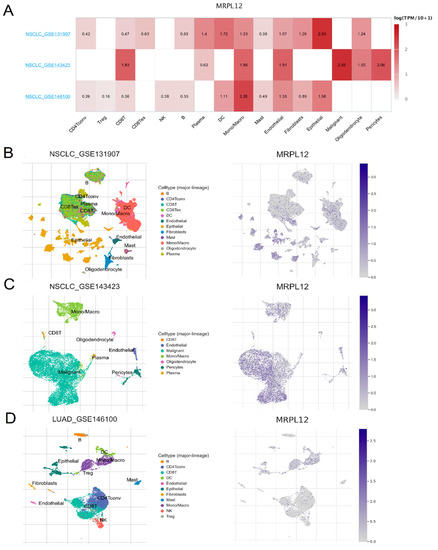 TISCH (http://tisch.comp-genomics.org/ (accessed on 15 October 2022)) is a single-cell RNA sequencing database focusing on the TME [42], which can provide detailed cell-type annotation at the single-cell level, enabling exploration of the TME across a diverse range of cancers. We utilized datasets from this database to analyze MRPL12 expression in the TME as a single-cell subset.