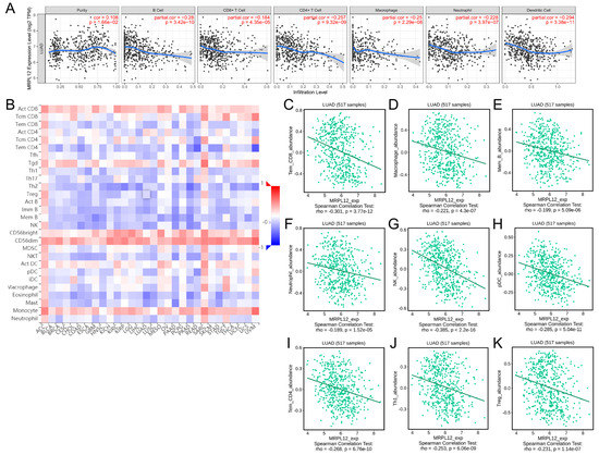 Correlation between MRPL12 expression and immune infiltrates in LUAD. (A) Correlation between MRPL12 and abundance of 6 immune cells in TIMER. (B) Heatmap of relationship between MRPL12 and abundance of 28 TILs in different tumors using TISIDB database. (C–K) MRPL12 was negatively related to the abundance of Tem_CD8, macrophages Mem_B, neutrophils, NK cells, pDC, Tem_CD4, Th1 cells, and Tregs in LUAD using TISIDB database.
