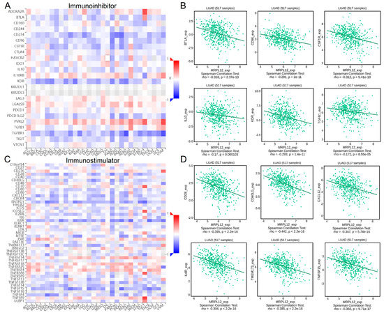 Immunomodulators, including immunoinhibitors and immunostimulators, are substances that regulate immune system function. Correlations between MRPL12 expression and immunomodulators were explored in TISIDB. A heatmap of the relationships between MRPL12 and immunoinhibitors in different tumors is exhibited in Figure 8A. In LUAD, MRPL12 was negatively correlated with multiple immunoinhibitors, including BTLA, CD96, CSF1R, IL10, KDR, and TGFB1 (Figure 8B). A heatmap of the relationships between MRPL12 and immunostimulators in various tumors is shown in Figure 8C. In LUAD, a negative correlation was observed between MRPL12 and CD28, CD40LG, CXCL12, IL6R, TMEM173, and TNFSF15 (Figure 8D).