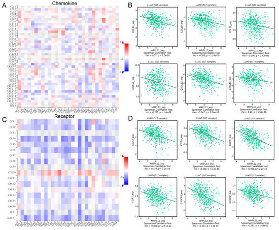 Correlation between MRPL12 expression and chemokines in LUAD. (A) Heatmap of correlations between MRPL12 and chemokines in different cancers from TISIDB database. (B) Correlations between MRPL12 expression and chemokines (including CCL14, CCL19, CCL23, CX3CL1, CXCL12, and CXCL16) in LUAD from TISIDB database. (C) Heatmap of correlations between MRPL12 and receptors across different tumors from TISIDB database. (D) Relationships between MRPL12 and receptors (including CCR2, CCR4, CCR6, CCR7, CX3CR1 and CXCR2) in LUAD from TISIDB database.