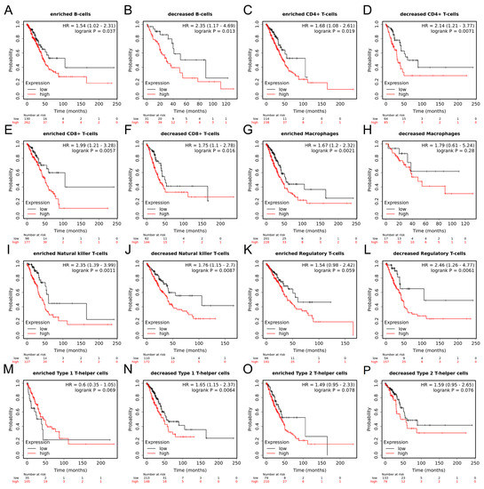 Prognostic value of MRPL12 in LUAD based on immune cell subgroups. (A–P) The prognostic value of MRPL12 expression in LUAD patients based on various immune cell subgroups using Kaplan–Meier plotter database.