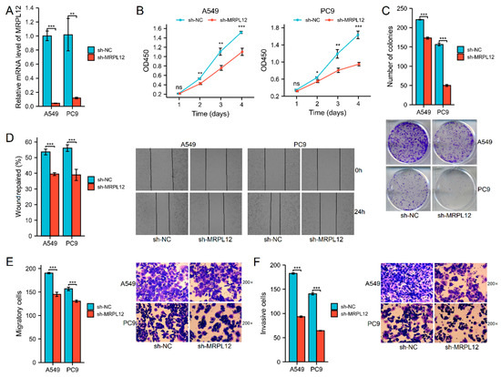 MRPL12 knockdown suppressed cell proliferation and invasion in LUAD. (A) MRPL12 mRNA expression in A549 and PC9 cells after sh-MRPL12 transfection. (B) Sh-MRPL12 inhibited LUAD cell growth according to CCK-8. (C) Sh-MRPL12 inhibited colony number of LUAD cells according to the colony formation assay. (D) Sh-MRPL12 reduced wound closure percent of LUAD cells according to wound-healing assay. (E,F) Sh-MRPL12 suppressed cell migration and invasion in LUAD according to Transwell assays. * p < 0.05, ** p < 0.01, *** p < 0.001; ns, no significance.
