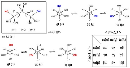 The rotational isomerism in the glycerol backbone has been extensively examined in both experimental and simulation studies [,,,,,,,,,,,,,,], which include a characterization study on Li+ glycerates used in a lithium battery []. In history, a glycerol crystal was first obtained by Koningsveld [] and reported to adopt a symmetric αα-conformer with gt/gt rotamers. The symmetric molecular conformation is confirmed in a more recent high-resolution X-ray diffraction analysis by Kusukawa et al. []. The rotational isomerism occurs in both the liquid and solution phases [,], while the proportions of the nine or six different conformers are inconsistent between neutron diffraction and simulation studies [,,]. For glycerol in the dilute aqueous state close to biological conditions, 220 MHz 1H-NMR spectroscopic analysis was conducted at a wide range of temperatures (−5~95 °C) in D2O solution by Koningsveld []. The NMR analysis has shown that glycerol in water exhibits a consistent rotational isomerism in the backbone independent of the temperatures examined. The backbone rotational isomerism proposed in the authentic 1H-NMR study had strong impact on the later stereochemical study of glycerol in the solution state [,,].