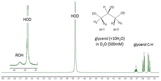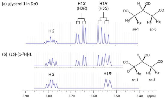 With high resolution 1H-NMR machines (Figure 2), glycerol dissolved in D2O gives a pair of double-doublet signals at δ 3.55 ppm and δ 3.65 ppm (Table 1), which are assigned to H1R (or H3S) and H1S (or H3R), respectively [,].