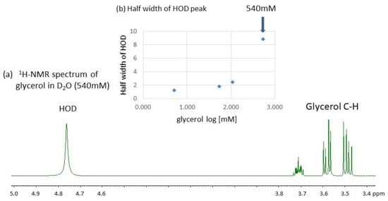 (a) A 500 MHz 1H-NMR spectrum of glycerol in D2O without DSS (540 mM at 20.5 °C). (b) Plots of the half-width of the HOD signal relative to those of glycerol C-H (H1S) signals against glycerol concentrations in D2O (5~540 mM).