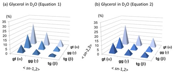 Glycerol in water gives the rotational isomerism among the nine or six different conformers as mentioned before (Figure 1). The rotational isomerism can be approximated with the multiplication products of the three staggered rotamers (gt, gg, and tg (%)) [,]. In the current 1H-NMR Karplus analysis, the three rotamers (%) are obtained with each of Equation (1) (eq 1) and Equation (2) (eq 2) as described above. The overall rotational isomerism is calculated from each of the two equations, and the results are denoted with eq 1 and eq 2 in Table 3.