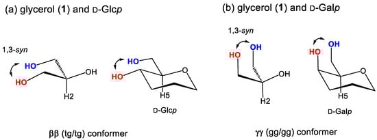 A 1,3-syn-periplanar repulsion between 1,3-diols in glycerol and the two types of saccharides, D-Glcp (a) and D-Galp (b).