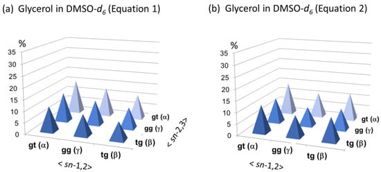On the other hand, the results in entries 3 and 4 indicate that DMSO-d6 and DMF-d7 used as solvents notably induce a significant change. They cause a significant change not only in the chemical shifts of glycerol C-H protons but also in the backbone rotational isomerism. It is worth noting that a notable shift arises in equilibrium between gt and tg rotamers toward tg while leaving the proportion of gg almost unchanged. Two 3D distribution maps in Figure 7 show that the backbone rotational isomerism is totally randomized in these solvents. The empirical relation of ‘gt > gg > tg’ among glycerols is no longer maintained when analyzed with Equation (2) (Figure 7b).