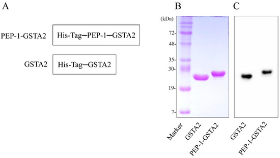 To obtain the recombinant PEP-1-GSTA2 protein, the cDNA for human GSTA2 was cloned into the pET-15b expression vector as described previously [29]. Briefly, PEP-1-GSTA2 was constructed via PCR. The plasmid PEP-1-GSTA2 was transformed into E. coli BL21 (DE3) and induced by adding IPTG (Duchefa, Haarlem, The Netherlands). Then, PEP-1-GSTA2 was purified and the protein concentration was measured as described previously [29,64].