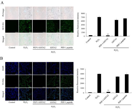 In order to investigate the effects of PEP-1-GSTA2 on ROS production and DNA damage in cells, DCF-DA and TUNEL staining were performed. The results showed that ROS and DNA damage were reduced after treatment of PEP-1-GSTA2, while treatment with GSTA2 had no effect (Figure 4).