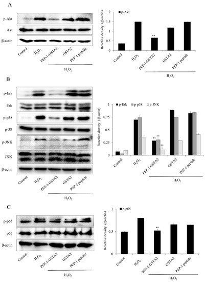 2.3. PEP-1-GSTA2-Activated Phosphorylation of Akt, MAPKs and p65