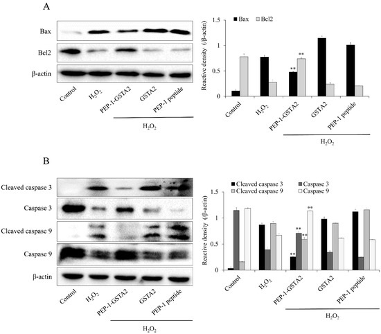 2.4. PEP-1-GSTA2 Regulated Bcl-2, Bax, Cleaved Caspase-3 and -9 Expressions