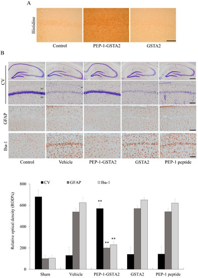 GFAP and Iba-1 staining showed that neuronal cells were markedly aggregated in the vehicle-treated group, whereas PEP-1-GSTA2 inhibited the aggregation of neuronal cells and similarly displayed the neuronal cells compared with the control group. There were no significant changes in neuronal cells found in GSTA2- and PEP-1-peptide-treated groups compared with the vehicle-treated group.