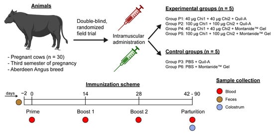 A total of 30 pregnant cows were randomly assigned to six groups (n = 5 per groups) to receive the vaccine formulations (P1, P2, P4 and P5 groups) or placebos (P3 and P6 control groups). The immunization protocol was a three-dose schedule (2 weeks apart) by intramuscular route.