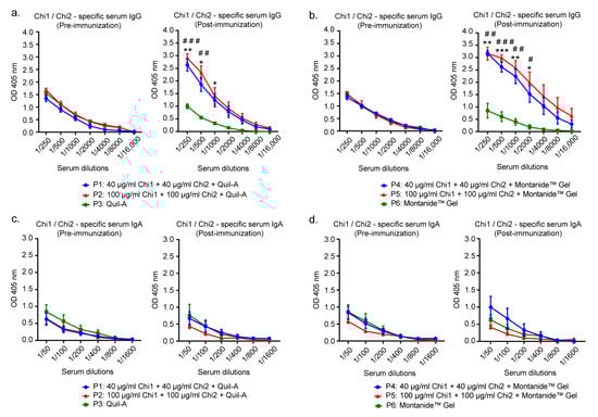 Serum antibody response in cows immunized with the vaccine formulations. Sera obtained before the first immunization and after the last immunization were used for the determination of anti-Chi1/Chi2 IgG and IgA antibodies. Samples were analyzed in duplicate, and the results are expressed as means ± SEM of absorbance values at 405 nm for each serum dilution, n = 5 animals per group. Anti-Chi1/Chi2 IgG (a) and IgA (c) antibodies from P1, P2 and P3 groups. Anti-Chi1/Chi2 IgG (b) and IgA (d) antibodies from P4, P5 and P6 groups. Statistical analysis was performed using a two-way ANOVA, followed by Tukey’s multiple comparison test. p < 0.05 was considered significant. Asterisks (*) indicate significant differences between the group immunized with the formulation containing 40 µg of each chimeric protein and the control group. * p < 0.05, ** p < 0.005, *** p < 0.0005. Number signs (#) indicate significant differences between the group immunized with the formulation containing 100 µg of each chimeric protein and the control group. # p < 0.05, ## p < 0.005, ### p < 0.0005.