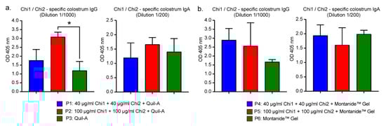 Chi1/Chi2—specific antibody levels in colostrum. (a) Colostrum from P1, P2 and P3 groups. (b) Colostrum from P4, P5 and P6 groups. Data analysis was by Kruskal−Wallis test, followed by Dunn’s multiple comparison test. p < 0.05 was considered significant. * p < 0.05.