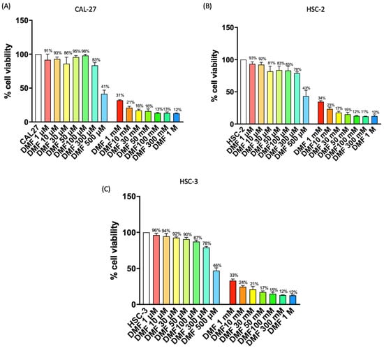 Cell viability of CAL27, HSC-2 and HSC-3 cells was evaluated using a mitochondria-dependent dye for live cells (tetrazolium dye; MTT) (M5655; Sigma-Aldrich). CAL27, HSC-2 and HSC-3 cells were plated on 96-well plates at a density of 4 × 104 cells/well to a final volume of 150 μL. After 24 h, CAL27, HSC-2 and HSC-3 cells were treated with DMF (Sigma-Aldrich®) for 24 h at increasing concentrations 1 μM, 10 μM, 30 μM, 50 μM, 100 μM, 300 μM, 500 μM, 1 mM, 10 mM, 30 mM, 50 mM, 100 mM, 300 mM, 500 mM and 1 M dissolved in basal medium. After 24 h cell were incubated at 37 °C with MTT (0.2 mg/mL) for 1 h, the medium was removed by aspiration and then cells were lysed with DMSO (100 μL). The extent of reduction of MTT to formazan was quantified by measurement of optical density at 540 nm (OD540) with a microplate reader, as previously described [28].